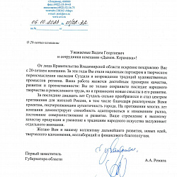 От лица Правительства Владимирской области искренне поздравляю Вас с 20-летием компании. За эти годы Вы стали надежным партнером в творческом переосмыслении наследия Суздаля и возрождении традиций художественных промыслов региона. Ваша работа является достойным примером качества, развития и преемственности: Вы не только сохраняете наследие народного творчества и ремесленного труда, но и привносите новые смыслы в его развитие.